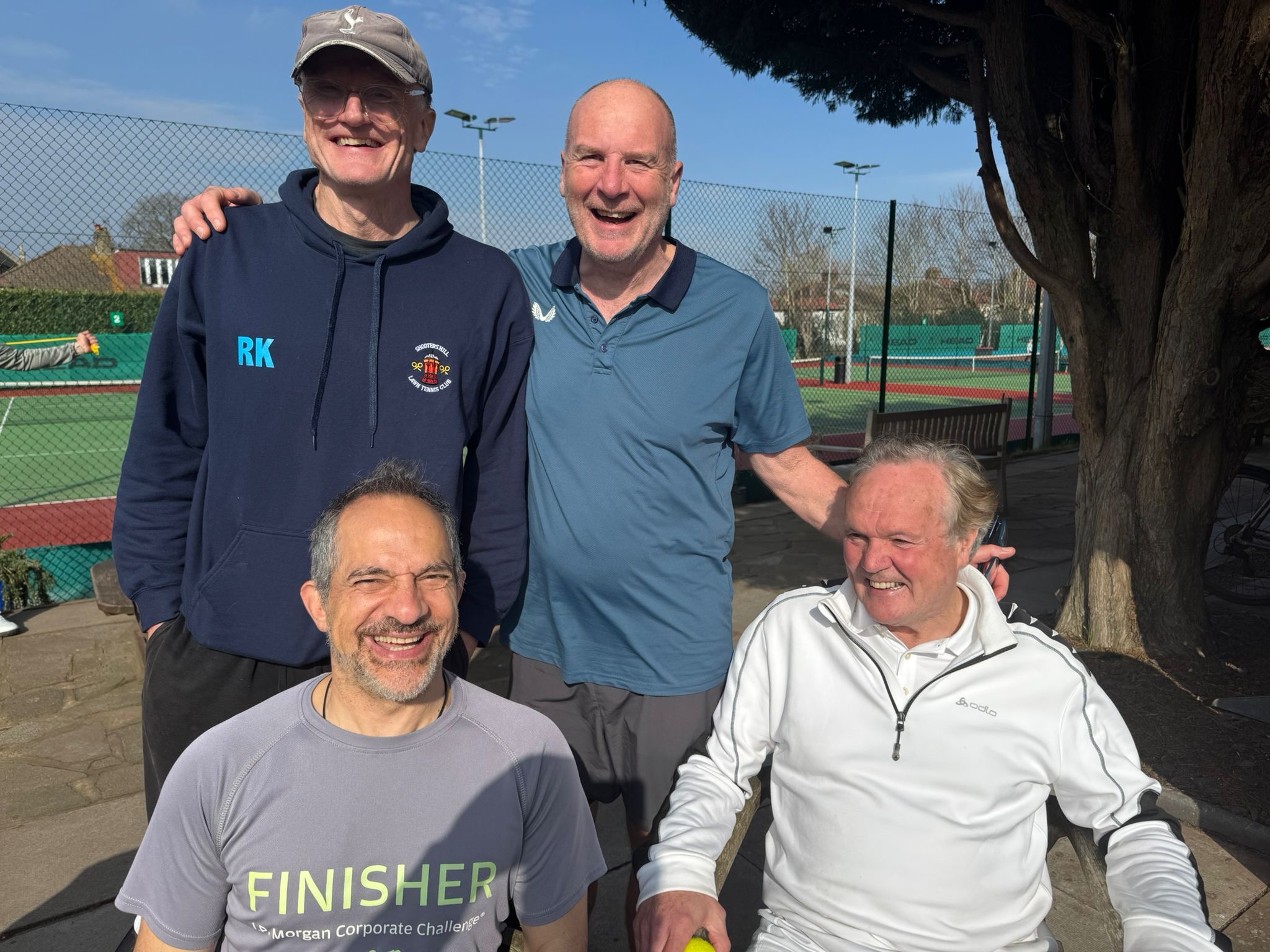 Over 60’s men won against Bearstead, who are the league winners. We then had lunch outside in the sunshine. The team playing were Greg Gadd, Richard Kershaw, Hessam Khoshnevisan and Rob Thomas. Thanks for the photo.